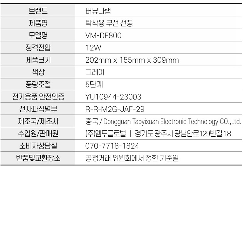 버뮤다랩 탁상용 20cm 선풍기 VM-DF800